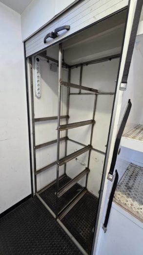 3em : L 1m45 x l 2m40, stockage avec étagères, éclairage, grande porte enroulable, escalier amovible.